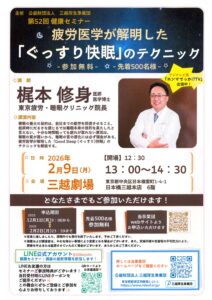 2026年2月9日(月)に公益財団法人三越厚生事業団主催により開催される、 『健康セミナー』のご案内をいただきました。今回は、睡眠に関するセミナー、健康な身体への第一歩、身近な大切テーマです。 睡眠の質を上げる良い機会で […]
