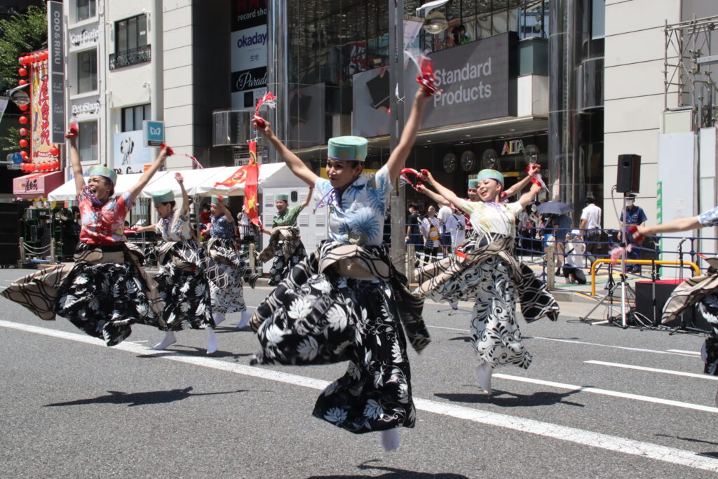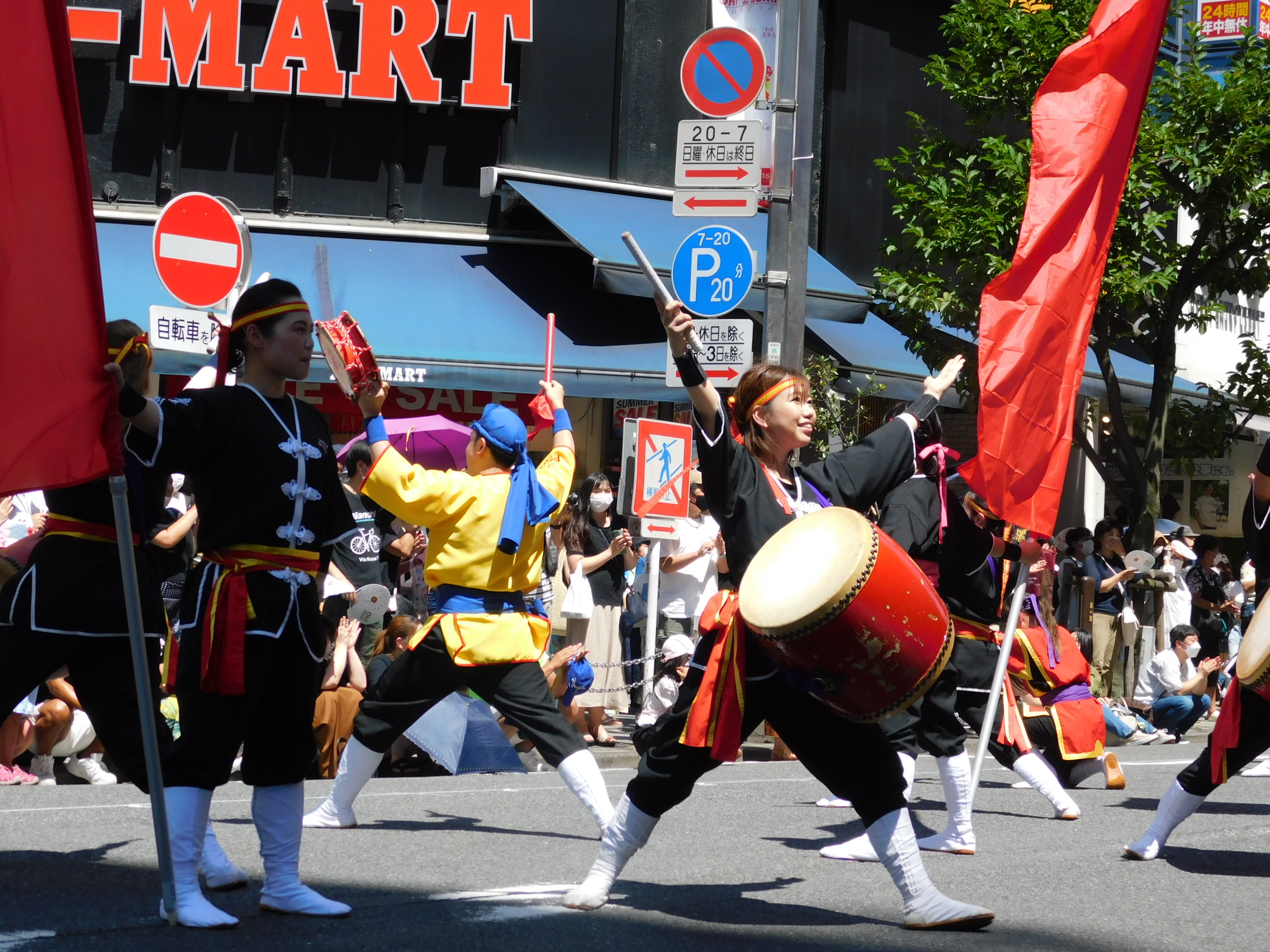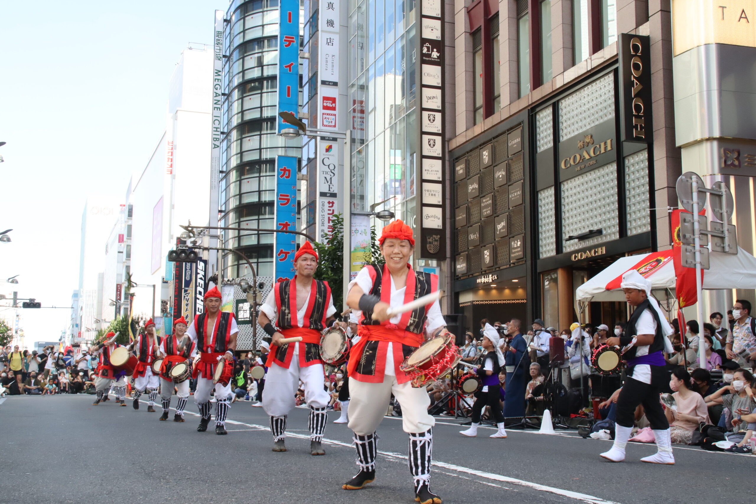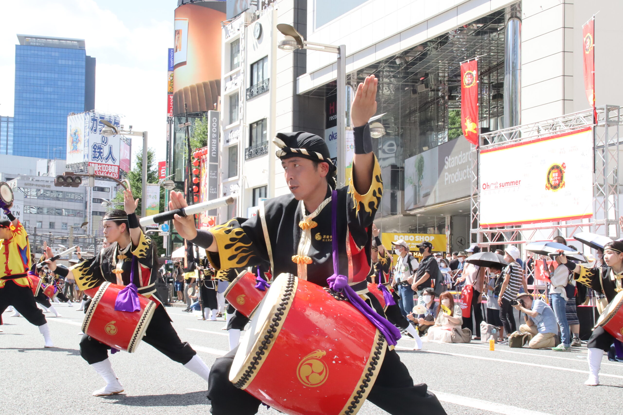 2022年7月30日(土)、コロナ禍で中止されていた新宿エイサーまつりが、3年ぶりに開催されました。例年より規模を縮小し、演舞会場は「新宿アルタ前」「新宿高野ビル前」「ビックカメラ前」「伊勢丹・丸井前」の4カ所となりました。演舞に先立って、アルタ前の会場ではオープニングアクト、オープニングセレモニーが行われました。35度を超える猛暑の中、熱気あふれる演舞が繰り広げられました。