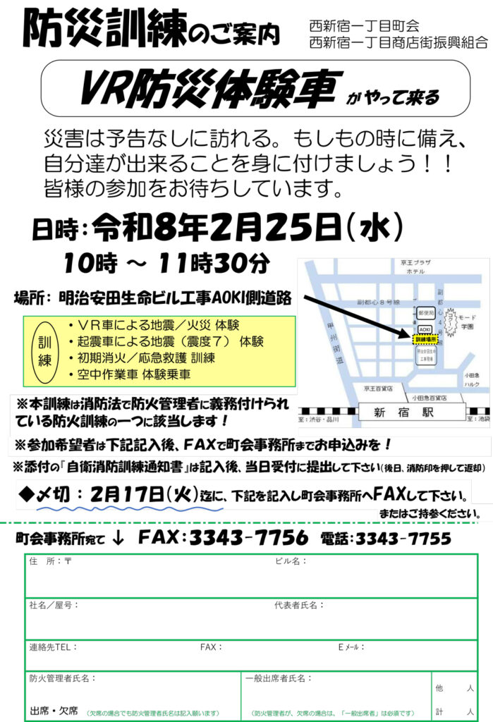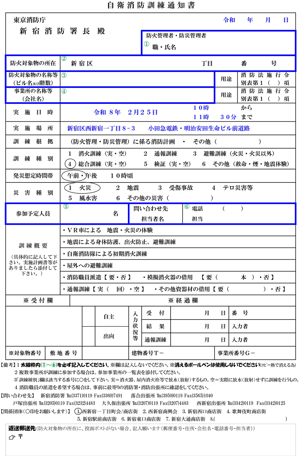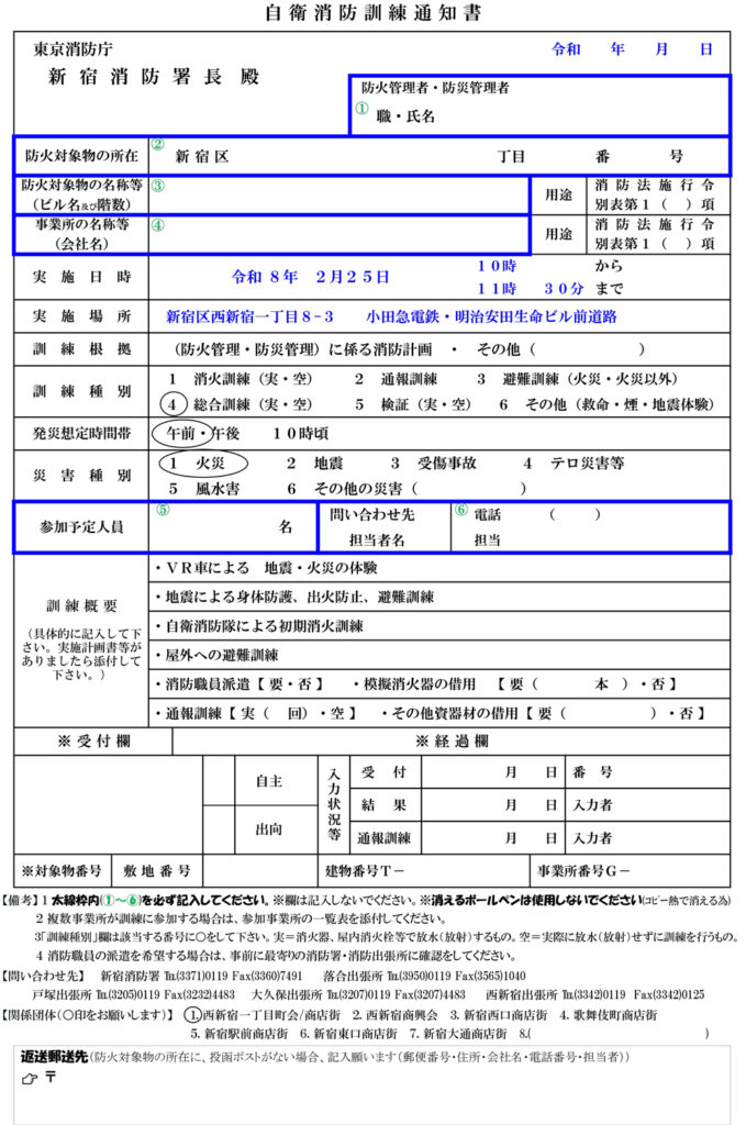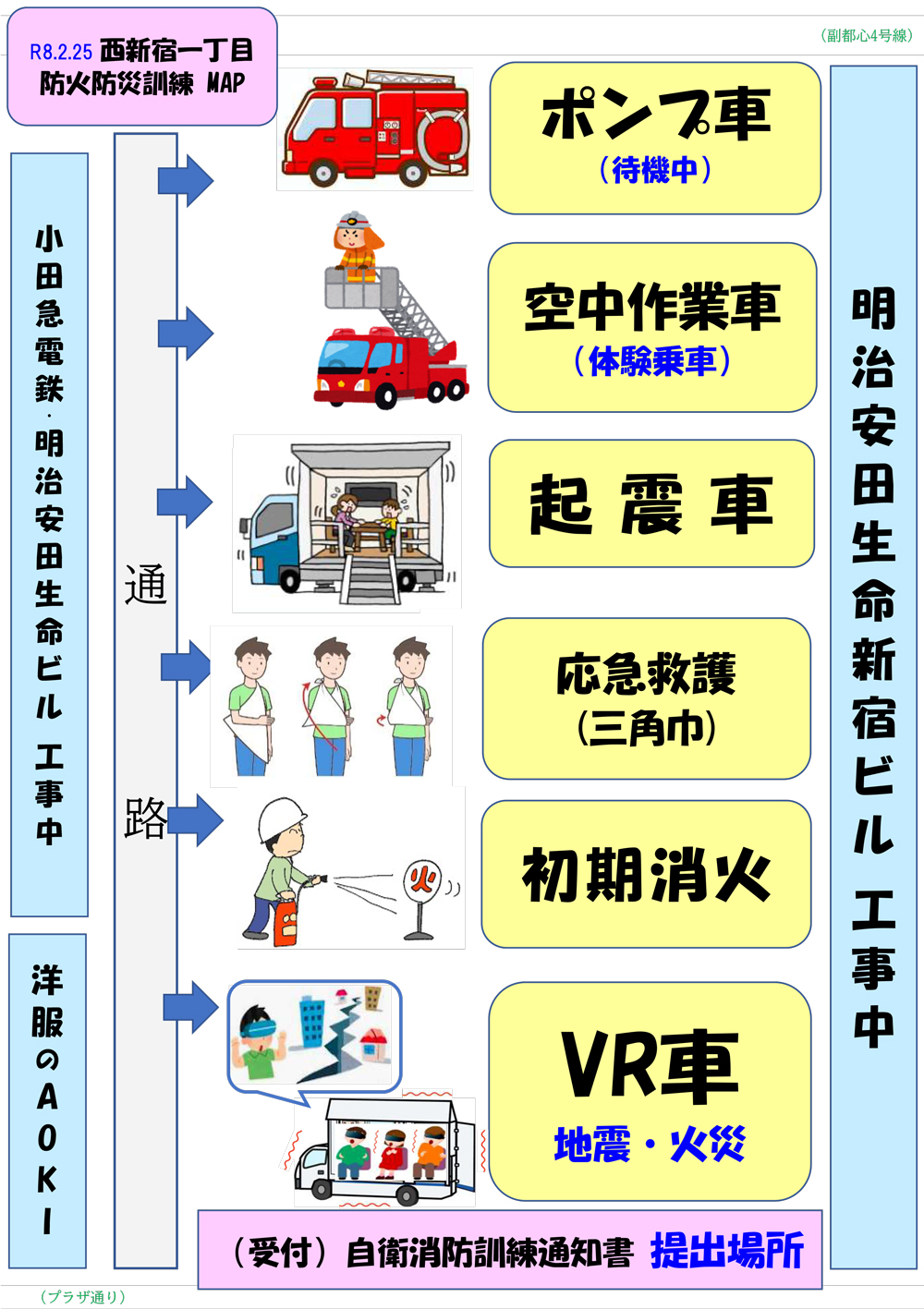 2月25日(水)10時~、明治安田生命新宿ビル工事AOKI側 前道路にて、防災訓練を実施します。訓練当日、「自衛消防訓練通知書」に必要事項をご記入のうえお持ちいただき、ご参加ください。 防災訓練のご案内