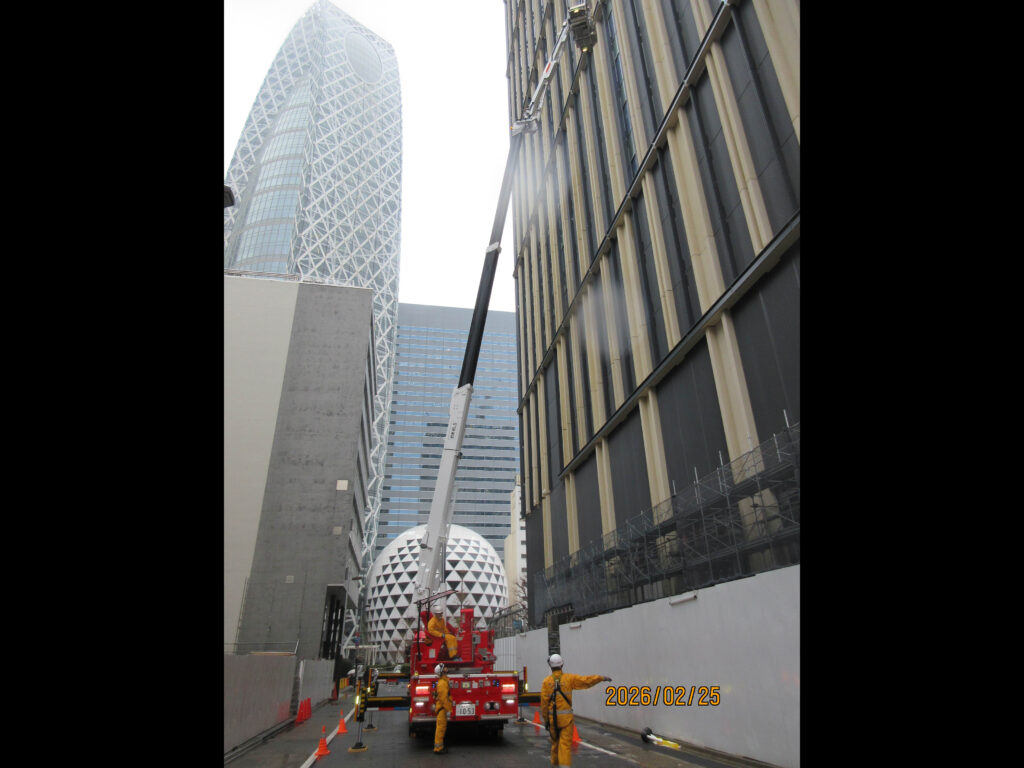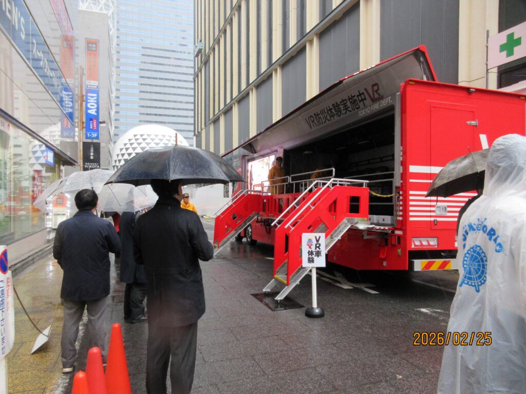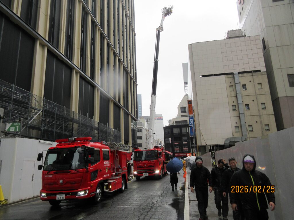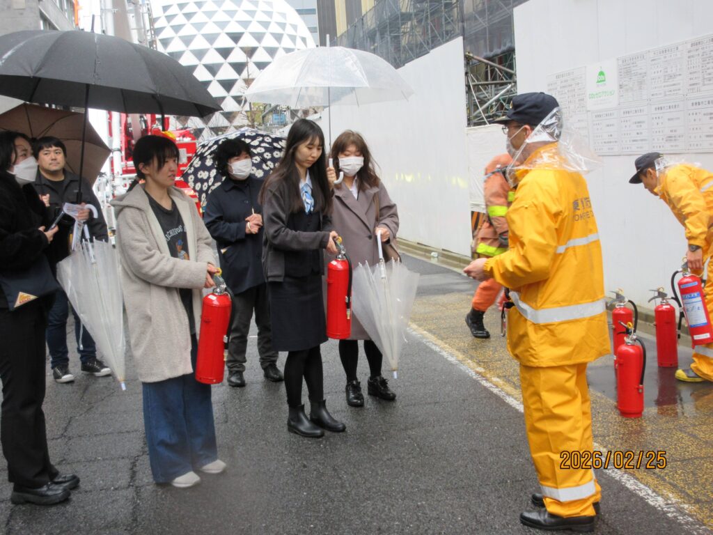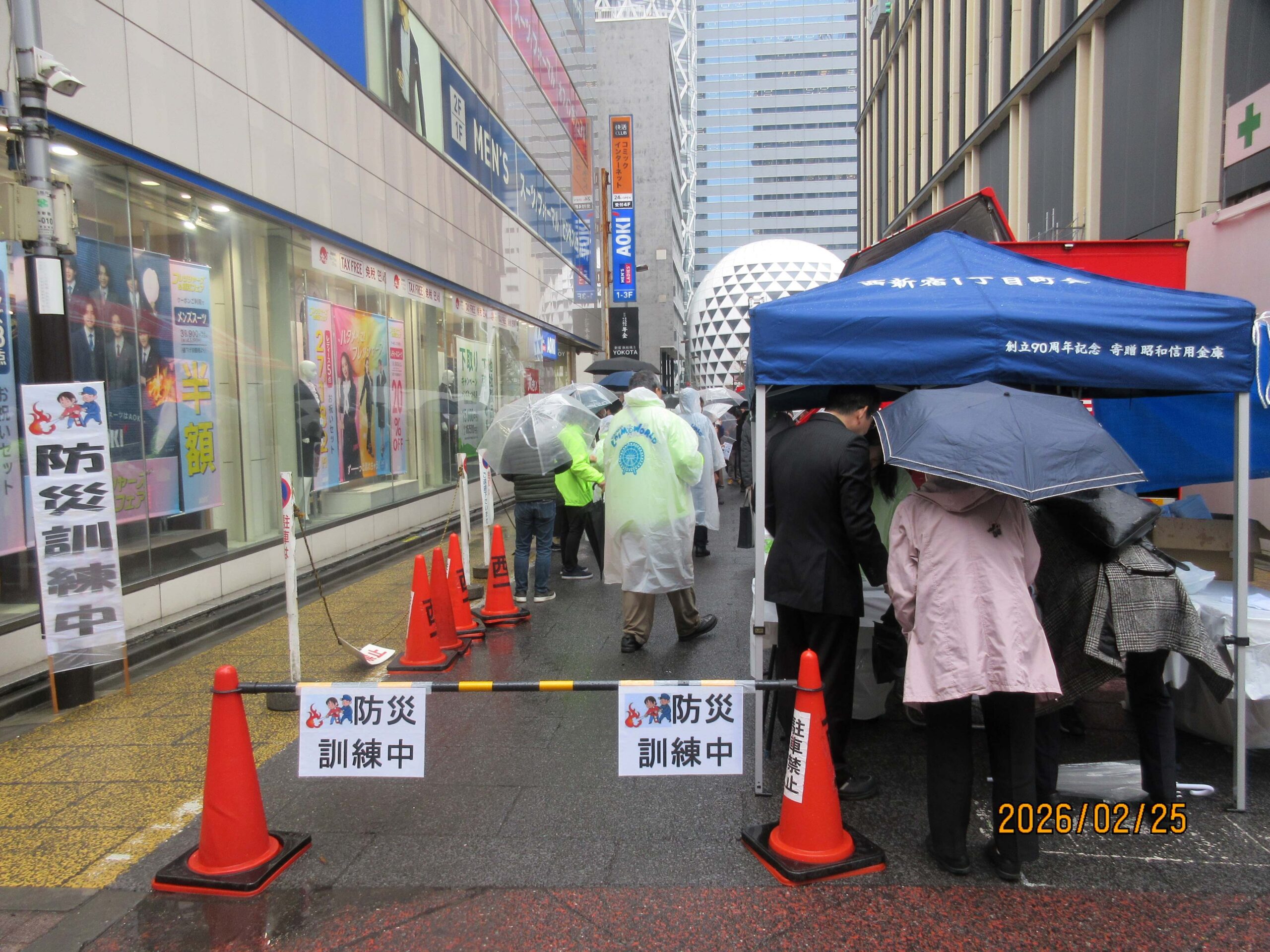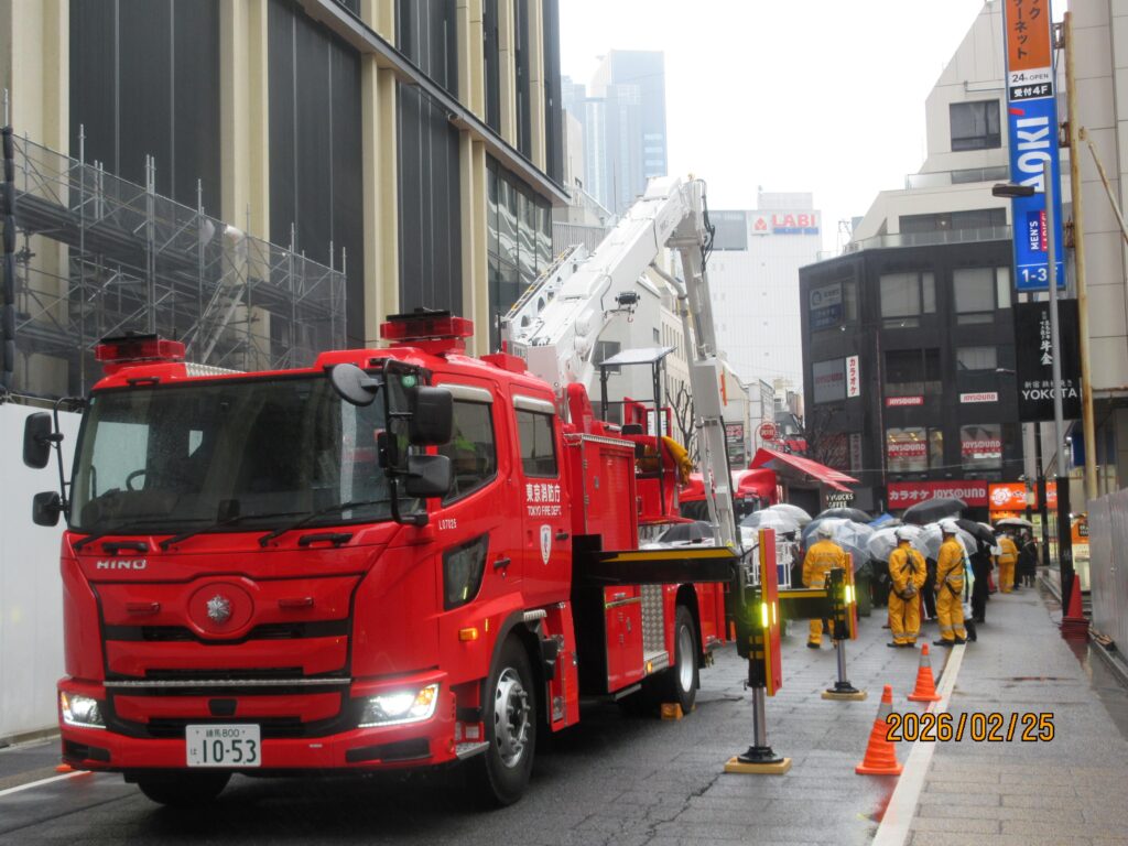 令和8年2月25日(水)午前10時から、旧小田急電鉄本社ビル前(明治安田生命新宿ビル工事AOKI側)の道路で、防災訓練が行われました。