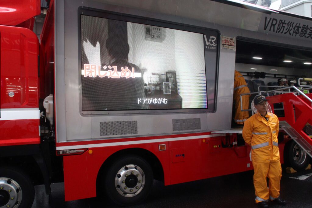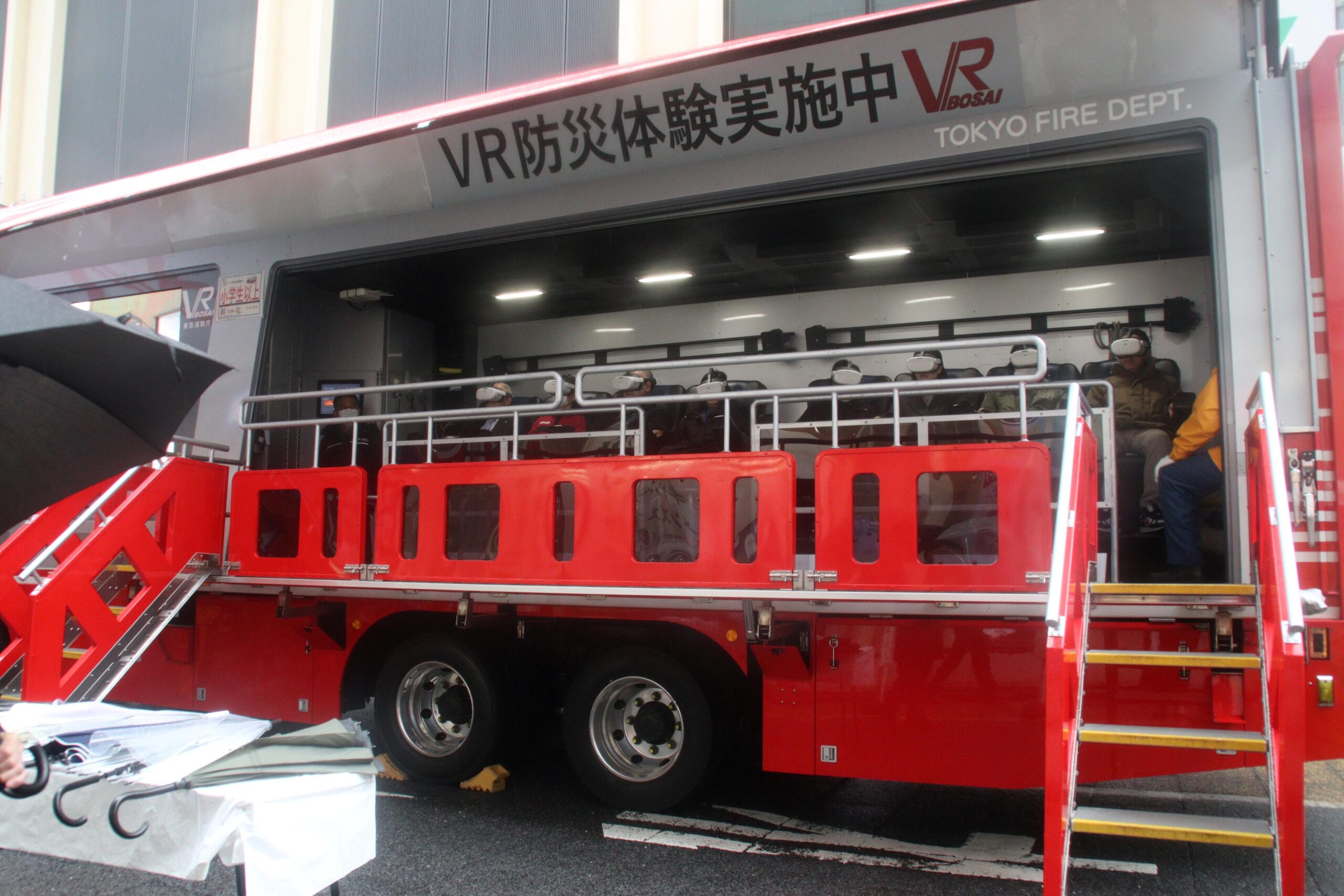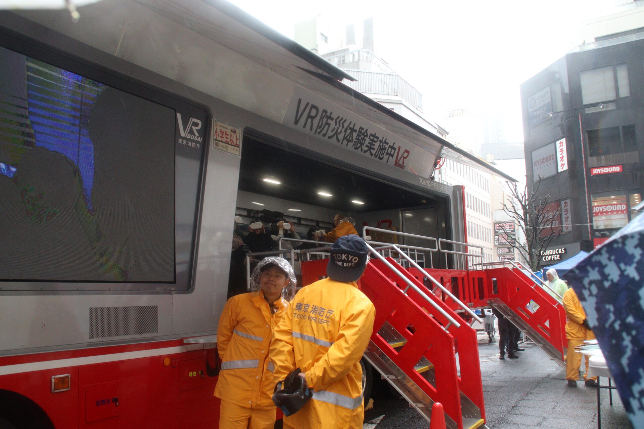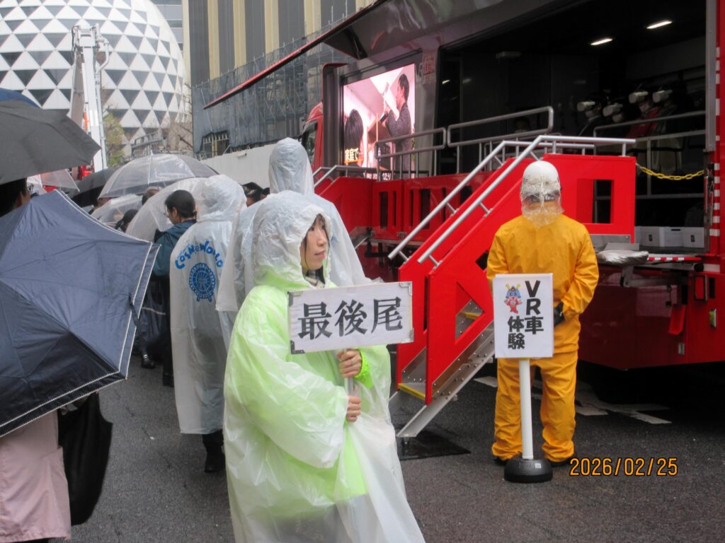 昨日までの好天とは打って変わって真冬に戻ったあいにくの雨天により、当初予定していた空中作業車体験、起震車訓練、応急救護(三角巾)訓練は中止となり、VR車体験、初期消火(消火器の使い方)訓練だけになってしまいましたが、大勢の皆様にご参加いただき熱心に取り組んでいただきました。